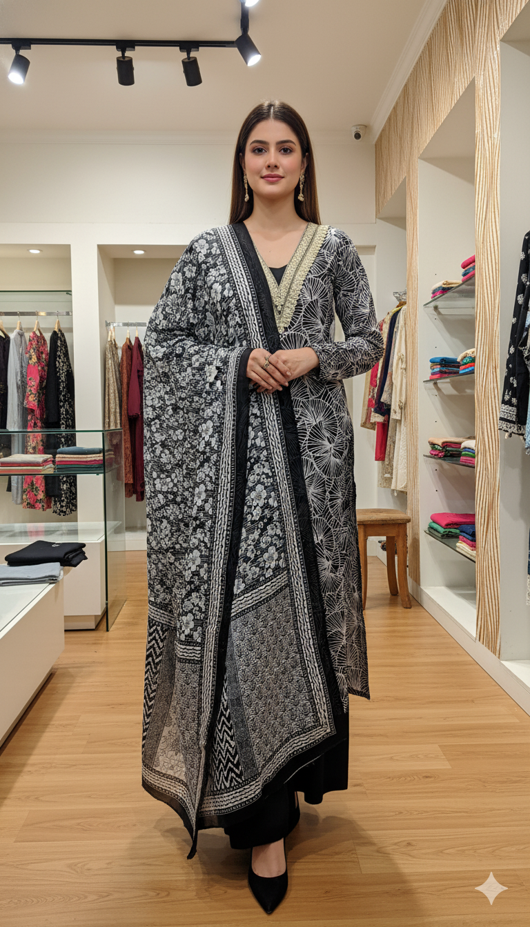 এই প্রিমিয়াম ব্ল্যাক থ্রিপিসটি তৈরি হয়েছে আধুনিক স্টাইল ও ঐতিহ্যবাহী কারুকাজের নিখুঁত সমন্বয়ে। গলার অংশে করা জয়পুরি স্টাইলের সুন্দর এমব্রয়ডারি পুরো ড্রেসে এনে দিয়েছে এক ভিন্ন রকম রাজকীয় এলিগেন্স। ব্ল্যাক বডির উপর করা সুন্দর প্রিন্টেড ডিজাইন ড্রেসটিকে দিয়েছে আরও বেশি আকর্ষণীয় ও গর্জিয়াস লুক।