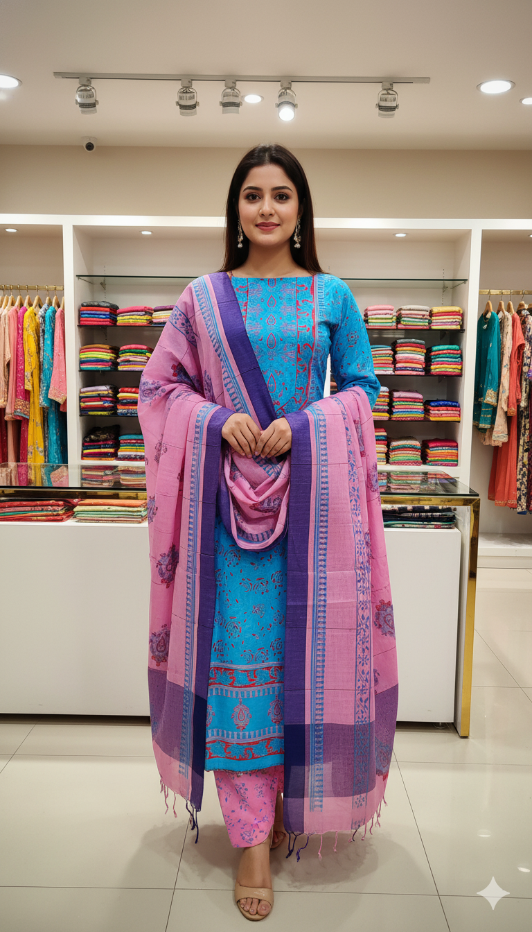 আকাশি, সফট ও নজরকাড়া রংগুলো যে কোনো স্কিন টোনে অসাধারণ মানিয়ে যায়। ক্যাজুয়াল ওয়্যার থেকে শুরু করে পার্টি, গেট-টুগেদার বা যে কোনো বিশেষ উপলক্ষে—এই ব্লক প্রিন্ট থ্রিপিস আপনাকে করে তুলবে আরও বেশি কনফিডেন্ট ও গর্জিয়াস।
