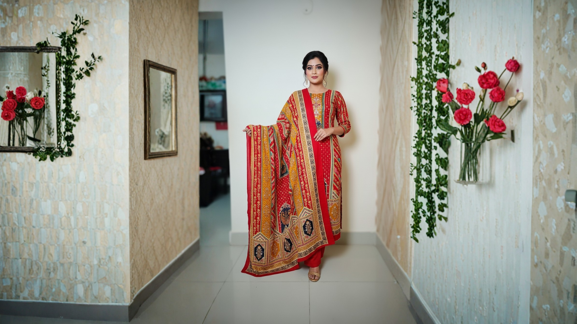 শার্টের ফ্রন্ট-প্যানেলে রয়েছে নজরকাড়া প্রিন্টের কাজ, যা দূর থেকেই দৃষ্টি কাড়ে। লাল, হলুদ ও গভীর শেডের কম্বিনেশন পুরো লুককে করে আরও প্রাণবন্ত ও রেডিয়েন্ট। হাতা ও বডির ডিজাইনে রয়েছে সিমেট্রিক্যাল প্যাটার্ন—যা পরিধানে দেয় একটি প্রপার এলিগেন্ট আউটফিট ভাইব।